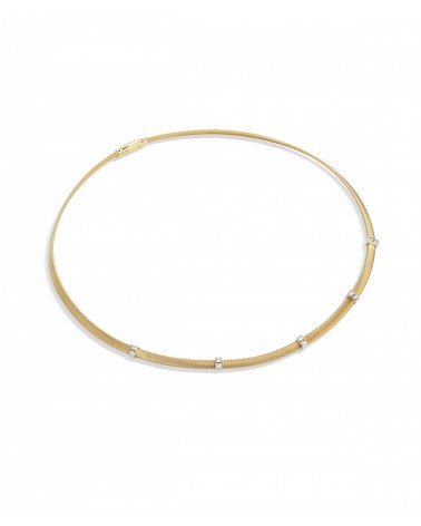 Un filo d'oro giallo 18kt, realizzato con la tecnica della Spirale Piatta e impreziosito da cinque barrette di Diamanti taglio brillante. Un girocollo dal design lineare e dall'eleganza senza tempo.